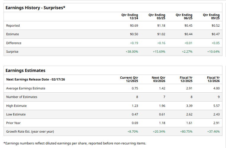 The energy titan is expected to announce its fiscal Q4 earnings for 2025 soon. Before this event, analysts expect this energy company to report a profit of $0.75 per share, up 8.7% from $0.69 per share in the year-ago quarter. The company has a promising trajectory of consistently beating Wall Street’s bottom-line estimates in each of the last four quarters.
