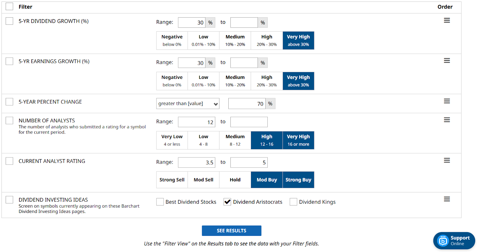 Using Barchart’s Stock Screener, I selected the following filters to get my list: