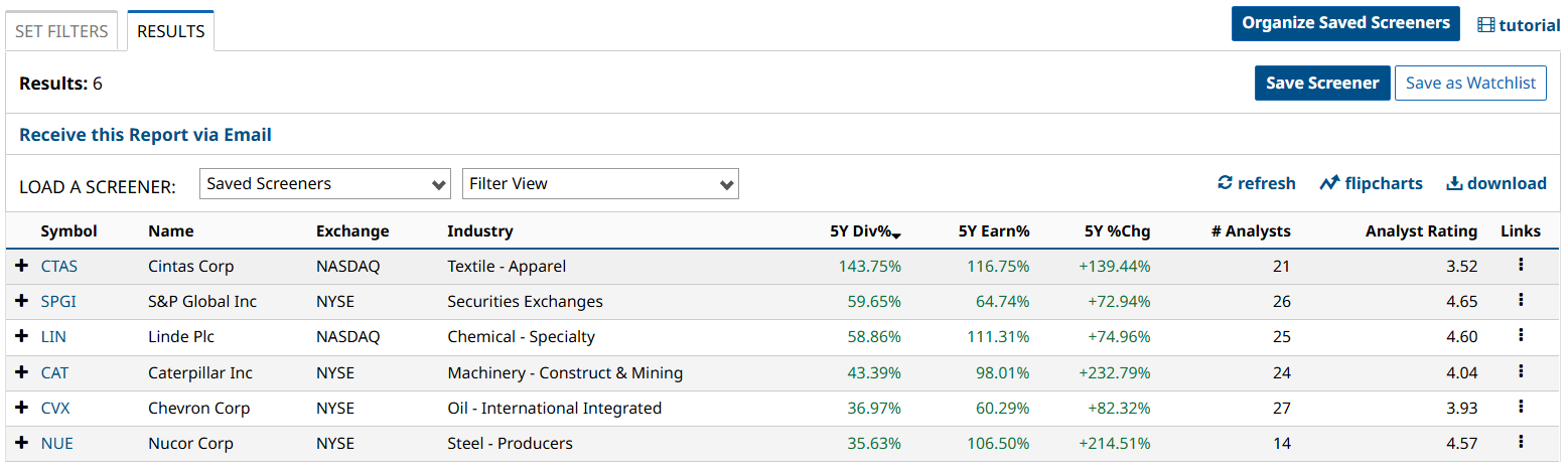 I hit the screen and got 6 results. I will cover three with the highest 5-YR Dividend Growth.