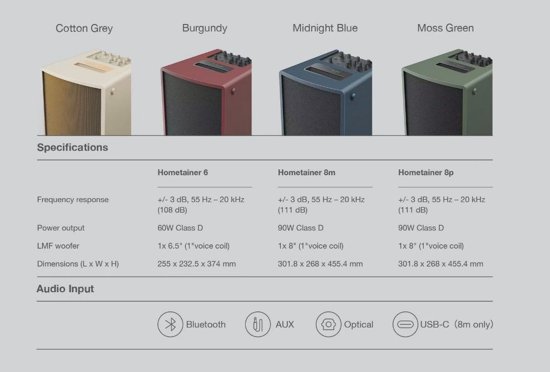 Combining refined aesthetics with superior functionality, Hometainer is crafted with a solid wooden body and acoustically transparent fabric over a sleek metal grille for a premium yet understated look. It is available in four colours: Cotton Grey, Burgundy, Midnight Blue and Moss Green, designed to complement Hong Kong home interiors, from minimalist apartments to classic décor.