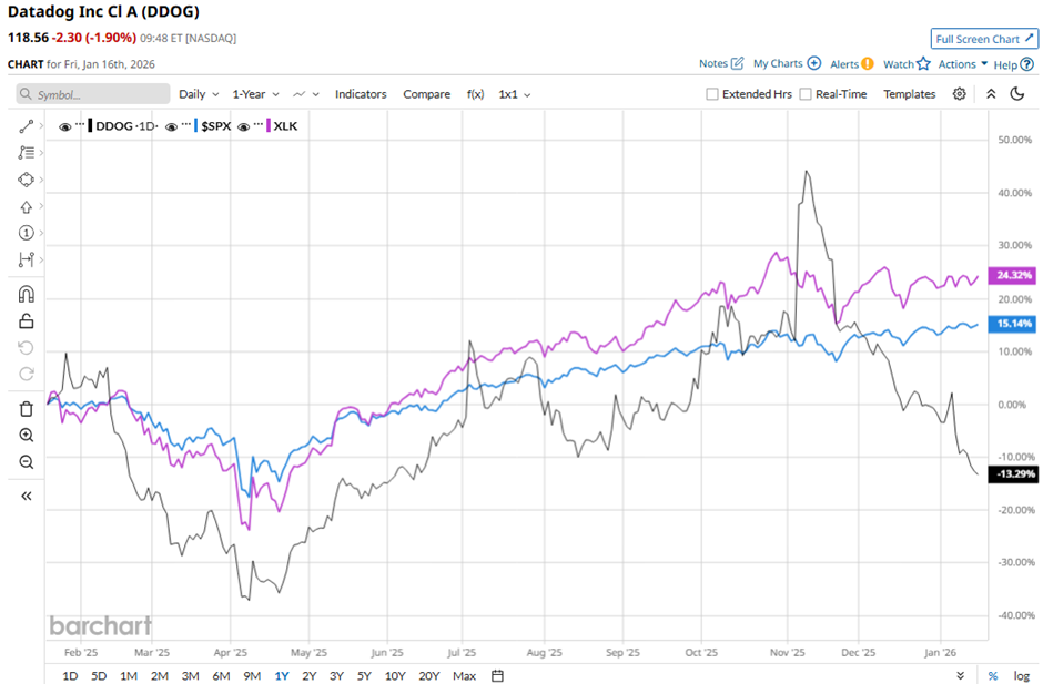 Shares of Datadog have decreased 11.7% over the past 52 weeks, underperforming the broader S&P 500 Index's ($SPX) 16.7% gain and the State Street Technology Select Sector SPDR ETF's (XLK) 27.2% return over the same period.