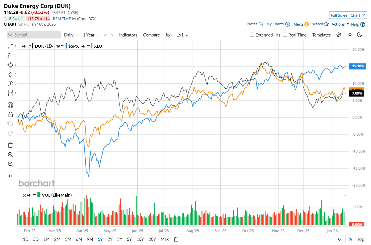 DUK has gained 8.6% over the past 52 weeks, lagging behind both the S&P 500 Index's ($SPX) 16.7% return and the State Street Utilities Select Sector SPDR ETF’s (XLU) 9.9% uptick over the same time period.