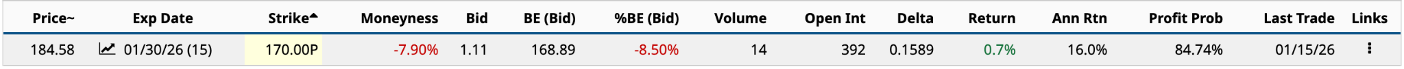 As shown above, the strike price is the same, but the annualized return is eight times higher at 16.0%. With an expected move to $174.44 on the downside, your profit probability is high at 84.74%.