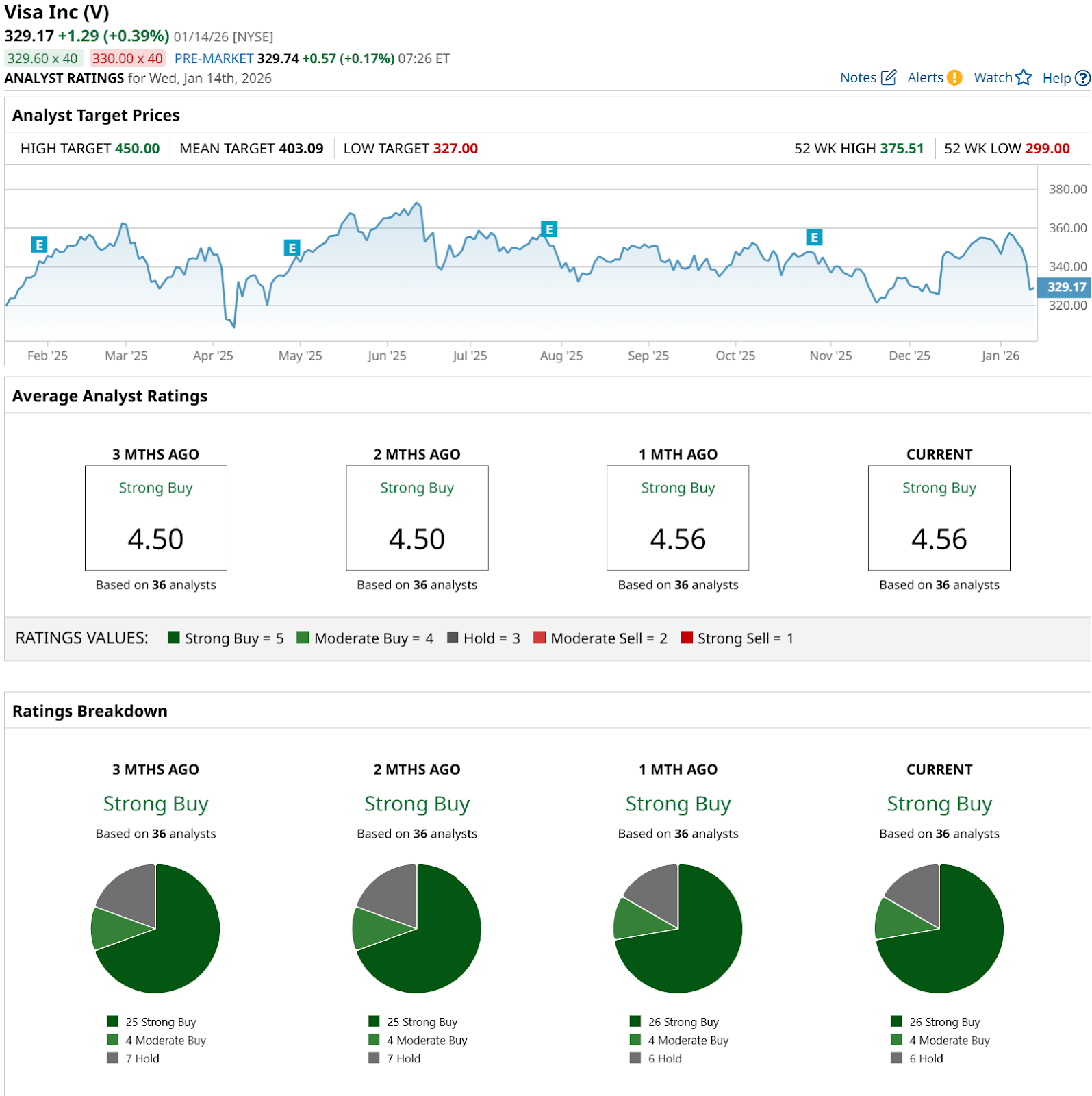 Looking across the full analyst group, all 36 analysts surveyed rate Visa a consensus “Strong Buy.” The mean price target is $403.09, which implies about 22.5% upside from the current level.