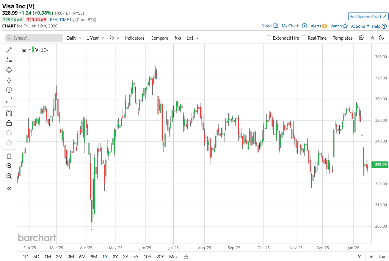 Over the past 52 weeks, the stock is up about 3.6%, but it is down roughly 6.3% year-to-date (YTD) as investors weigh the political noise around swipe fees and regulation.