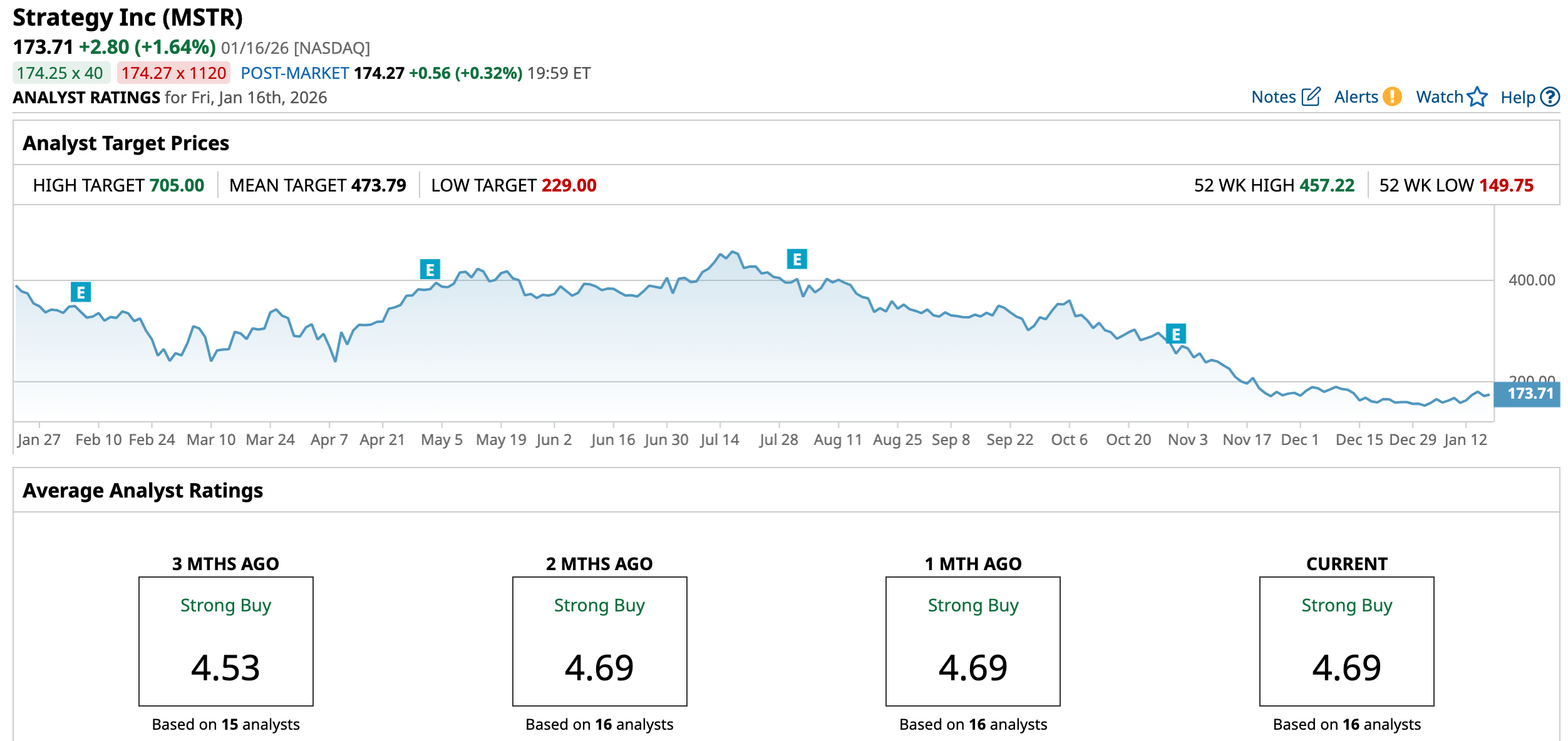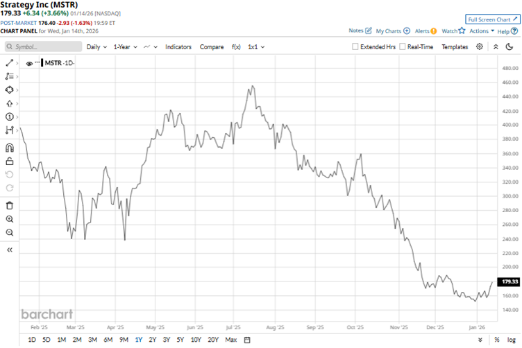 It had reached a 52-week high of $457.22 in July 2025, but is down 62% from that level. However, as Bitcoin has resurged following the “crypto winter,” the stock has gained 10.4% over the past five days. It is up by 16% from its 52-week low of $149.75 reached on Jan. 2, 2026.