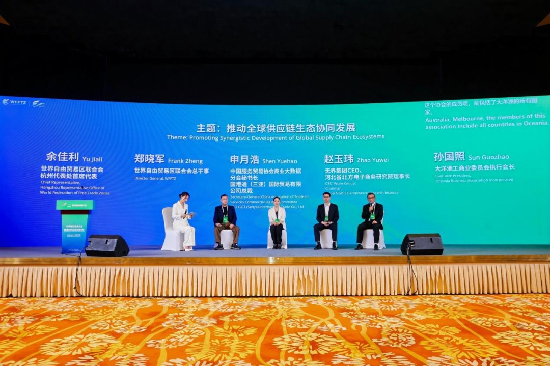 During the morning dialogue session, Frank Zheng (Director-General, WFFTZ), Shen Yuehao (President, Guo Gang Tong (Sanya) International Trade Co., Ltd.), Zhao Yuwei (CEO, Wujie Group), and Sun Guozhao (Executive Chairman, Oceania Business Association Incorporated) discussed global supply chain ecosystem collaboration. The panelists agreed that the future of supply chain competition lies in transitioning from "chain collaboration" to "network building," with data trust as its foundation and specialized third-party service providers as catalysts. Artificial intelligence will profoundly change trade patterns, and enabling SMEs to integrate into global networks affordably and conveniently is key to building resilient supply chains.