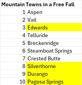 Note, none of the above items are going to lead to a cliff drop of a 60% decline in values in the core ski towns like Aspen, Telluride, Steamboat, Breckenridge, Vail, Crested Butte, etc.