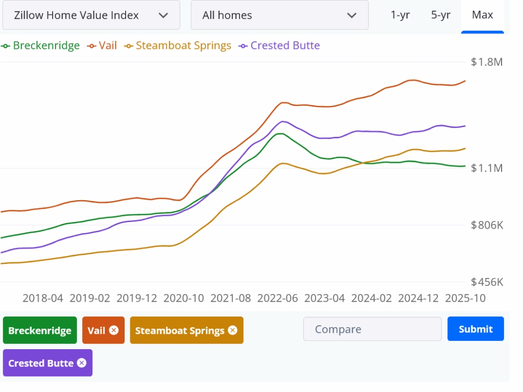 The numbers are giving a radically different answer. Take a look at this chart of all the sales in Zillow until 10/31. Look at Steamboat and Vail, both have continued to increase. Furthermore look at Crested Butte and Breckenridge, they have come off their highs, yet I would be hard pressed to classify either as a free fall