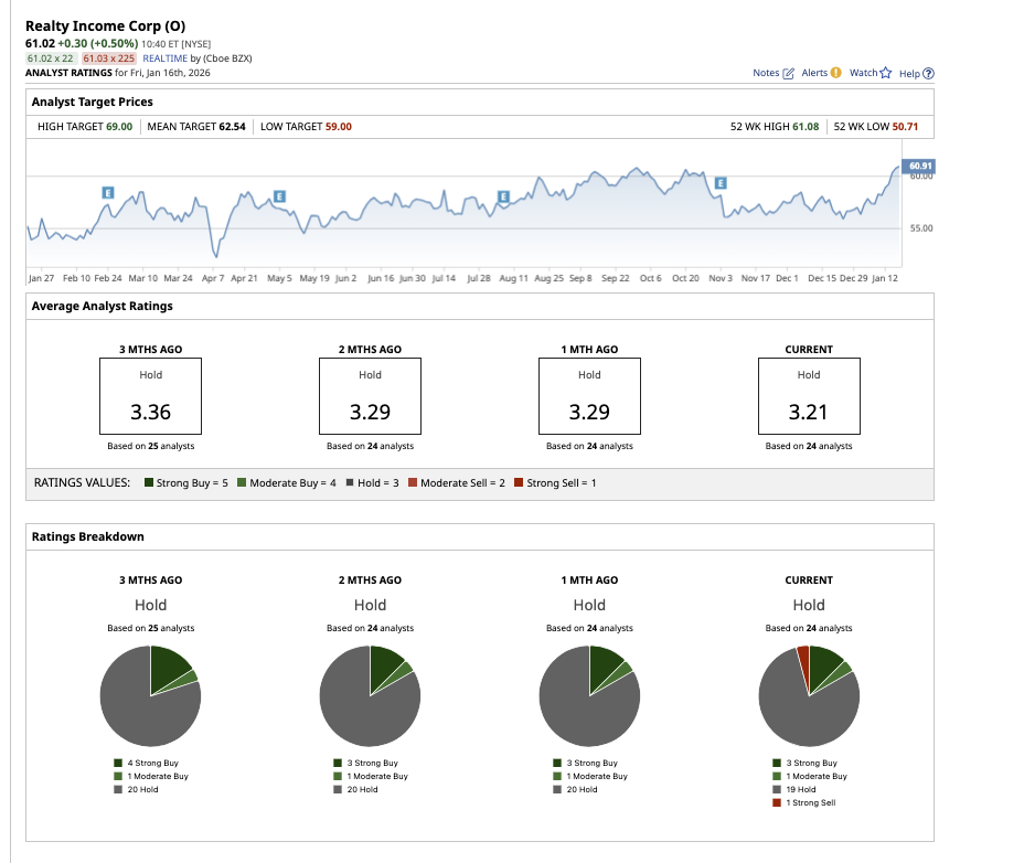 Overall, the REIT has a “Hold” rating. Out of the 24 analysts that cover Realty Income, three rate it a “Strong Buy,” one rates it a “Moderate Buy,” 19 rate it a “Hold,” and one rates it as a “Strong Sell.”