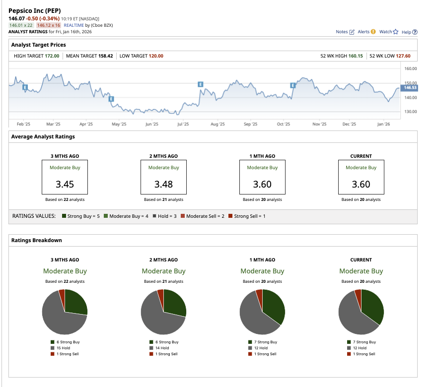 Overall, PepsiCo stock has an average “Moderate Buy” rating. Out of the 20 analysts covering the stock, seven have a “Strong Buy" rating, 12 suggest a “Hold,” and one rates it as a “Strong Sell." The mean target price for PEP is $158.42, which is 8.4% above its current levels. The Street-high estimate for the stock is $172, which implies upside potential of 17.7% over the next 12 months.