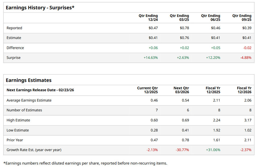 Houston, Texas-based Coterra Energy Inc. (CTRA) is an independent oil and gas company that develops, explores, and produces oil, natural gas, and natural gas liquids. Valued at $19.6 billion by market cap, the company develops oil and natural gas with a focus on protecting and preserving air quality, water resources, and the land on which it operates. The oil giant is expected to announce its fiscal fourth-quarter earnings for 2025 in the near term.