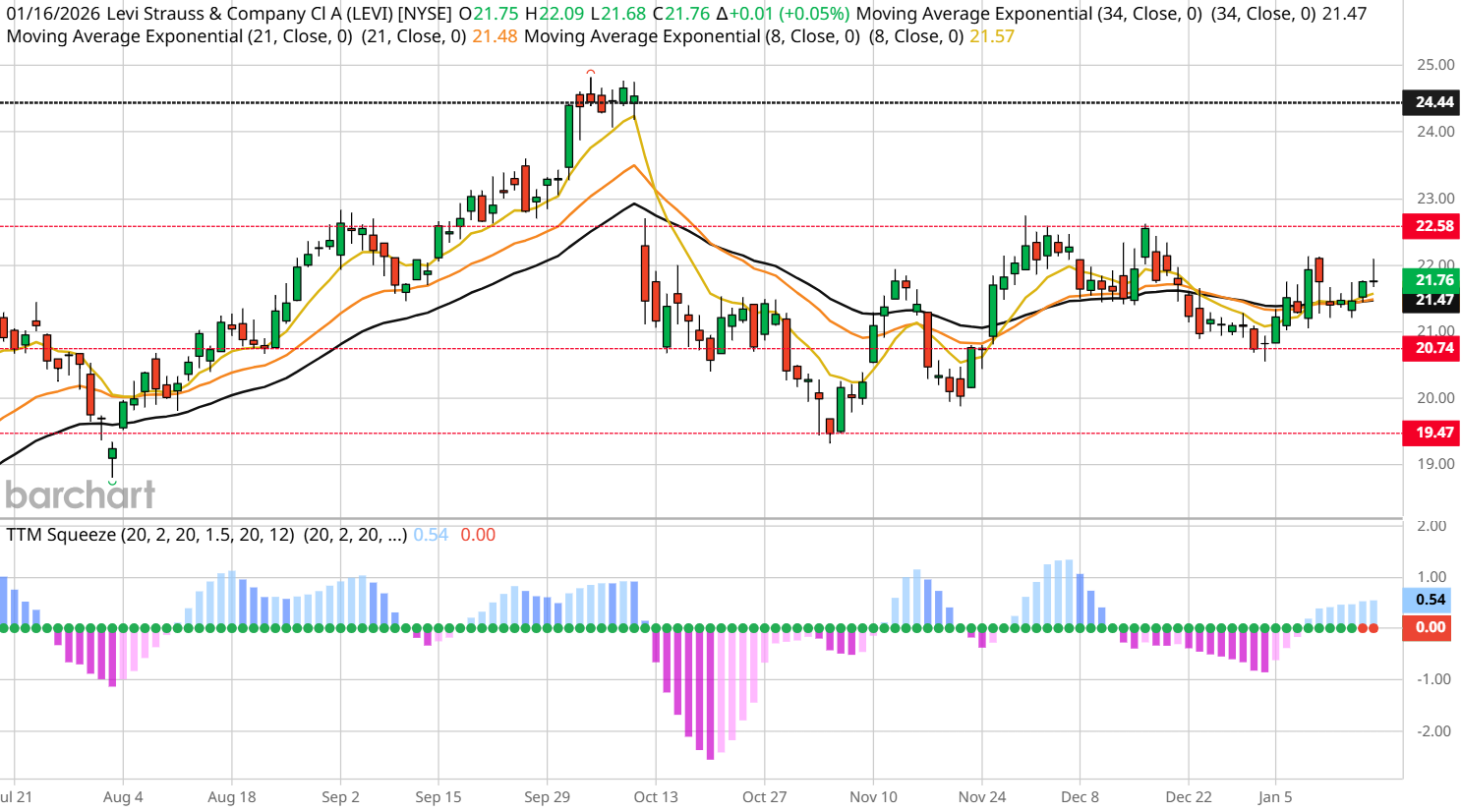 Though Levi has been rangebound between 20.74 and 22.60, a breakout above the multi-week high of 22.74 should send Levi on a rapid ascent into a gap fill above $24 and position it to challenge the multi-year high of $24.82 (a roughly 10% gain). The key here would be the "firing" of the “Squeeze,” which should occur above $22.25.