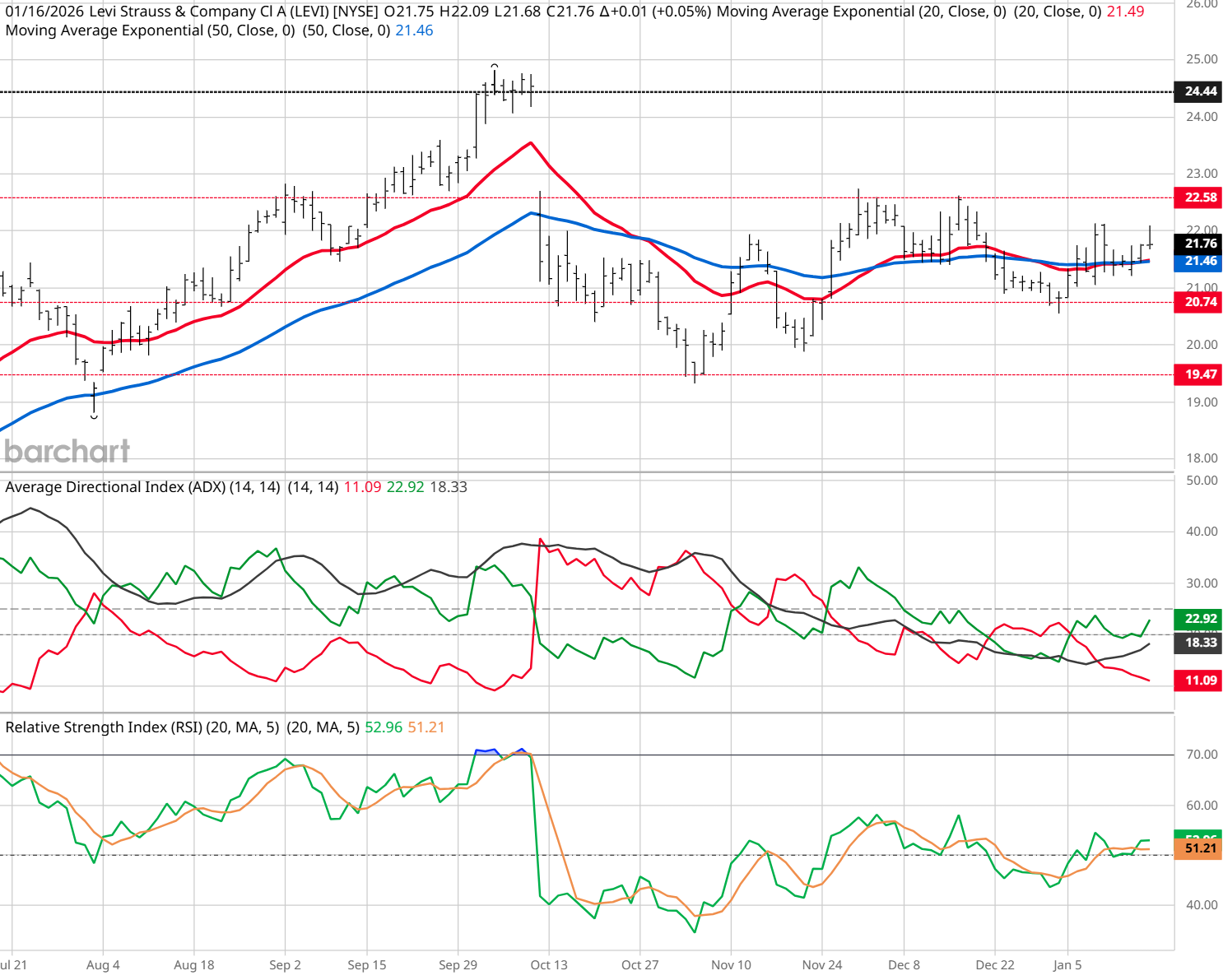 LEVI is currently trading above both its 20- and 50-day moving averages, while the 20-day is merging with its 50-day counterpart as both begin to slope higher, which is typically a bullish indicator. Plus, the stock has a “Buy” signal from Barchart's Trend Seeker, and is in a rising ADX and RSI environment.