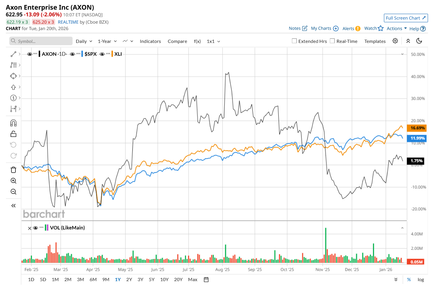 AXON has gained 5.6% over the past 52 weeks, underperforming both the S&P 500 Index's ($SPX) 16.9% return and the State Street Industrial Select Sector SPDR ETF’s (XLI) 20.2% uptick over the same time period.