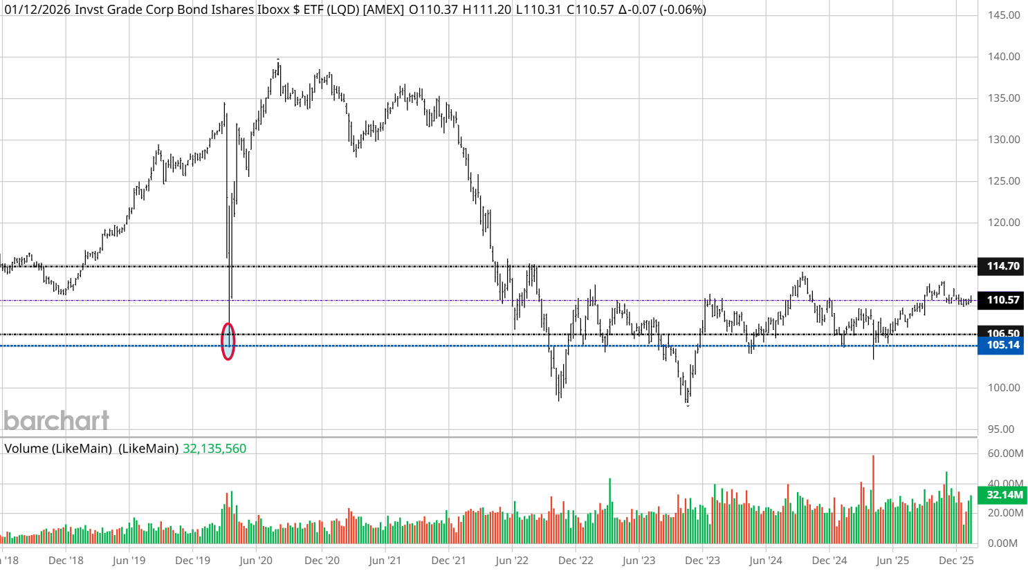 One deep-pocketed options trade on LQD caught my eye last Friday, when a trader bought the monthly June 18, 2026, $110-strike straddle on the corporate bond fund. A long straddle is a type of options trade that is neutral from a sentiment perspective, since it involves the purchase of both a call option and a put option at the same strike price – but it’s inherently bullish on volatility, since it typically requires a fairly large directional move to yield a profit.