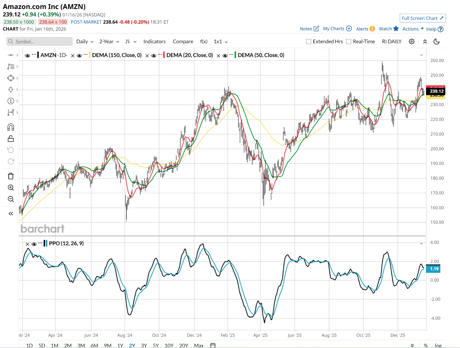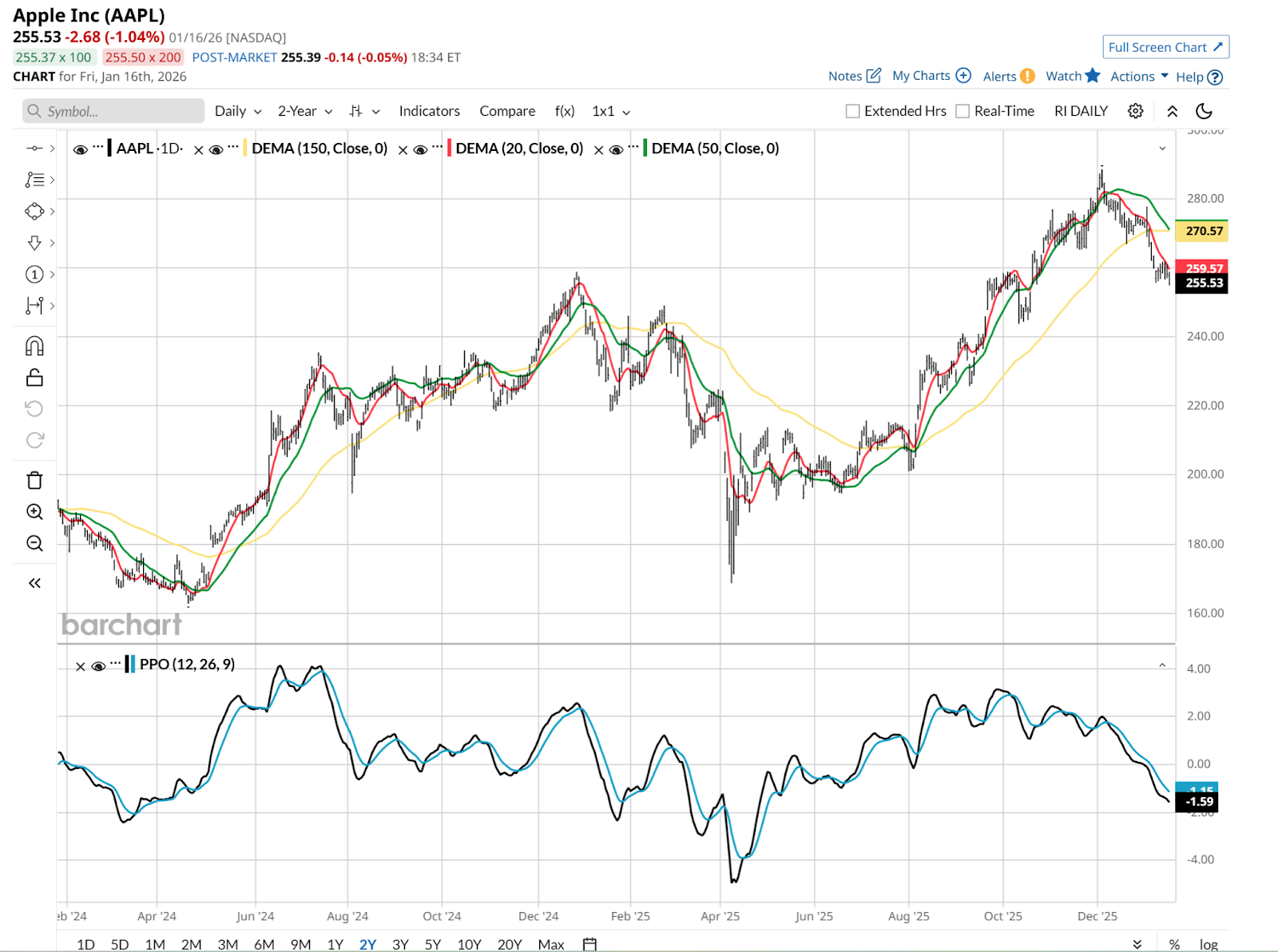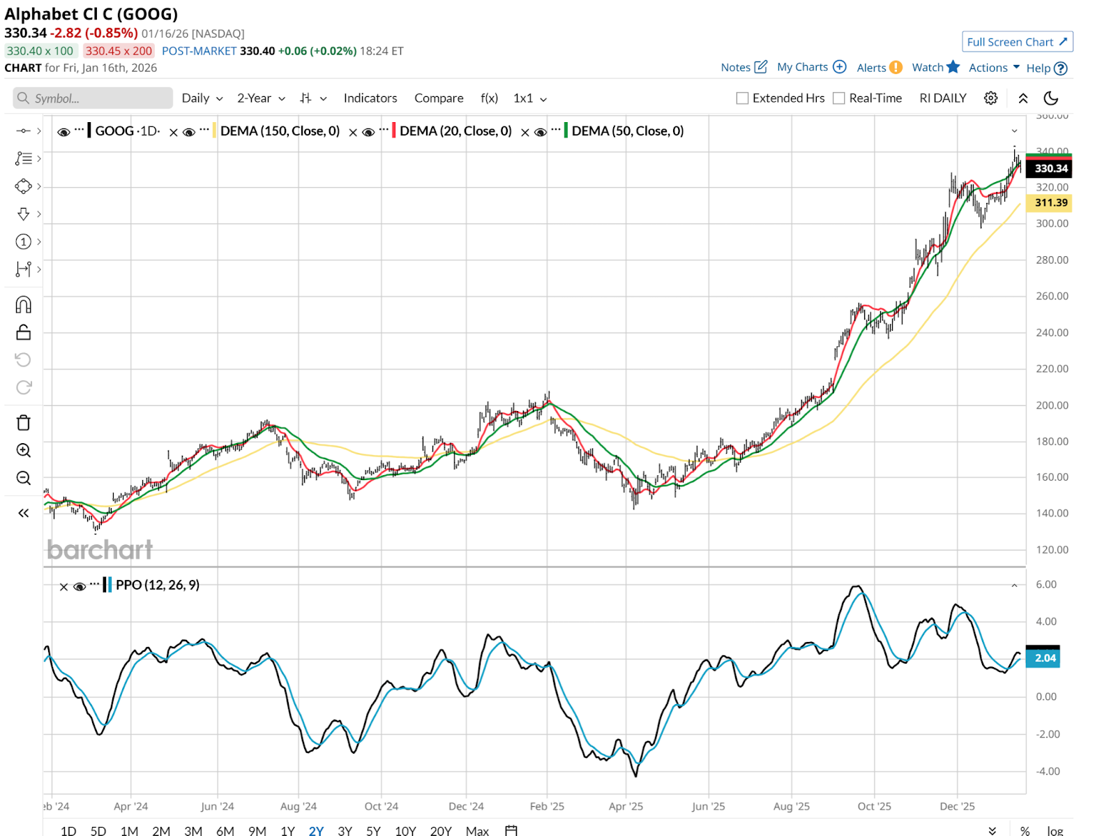 Not only is it down, its 20-day moving average is now off more than 10% from its all-time high set in early December, and the PPO indicator at the bottom of the above chart looks like it just dipped further down. That’s not a good sign at all and could put $200 in play later this year if the broader market starts to suffer.