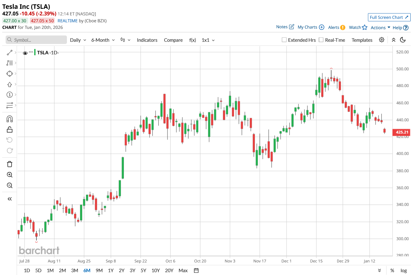 Tesla, based in Austin, Texas, designs and manufactures electric vehicles, energy storage systems, and AI‑driven software, with a market value near $1.46 trillion. Its share price stands at $427.05 as of Jan. 20, with a year‑to‑date (YTD) return of -5.4% and a 52‑week decline of -0.25%.