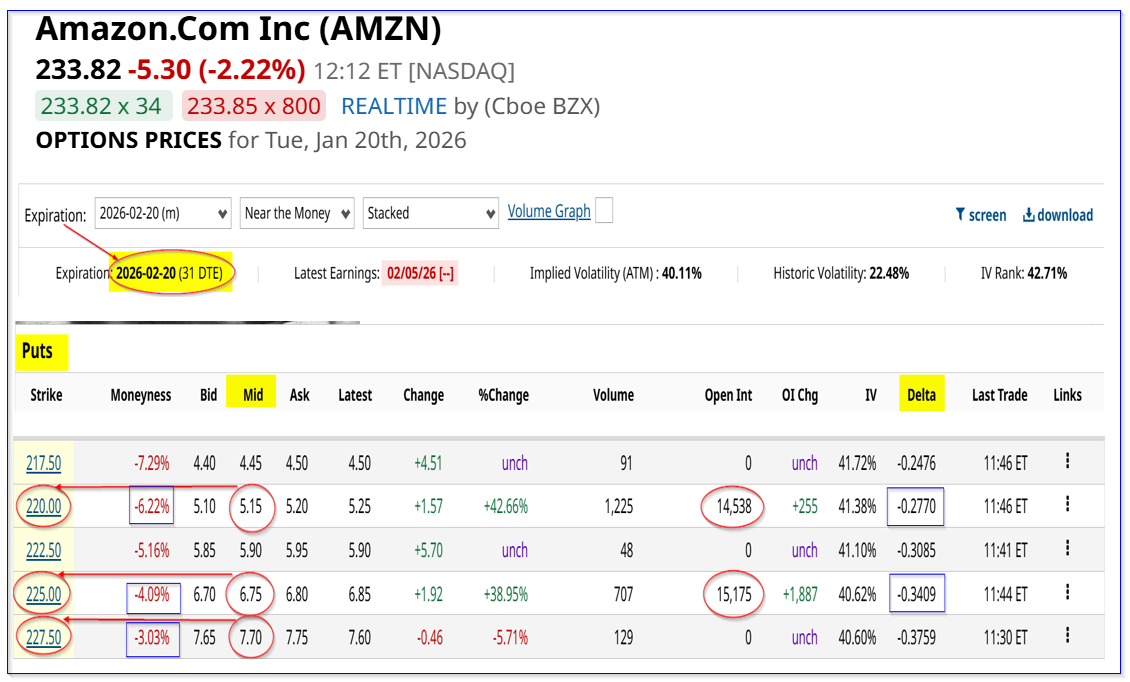 At the time, AMZN was at $232.38, close to today's price, but a one-month (12-26-25 expiry) short-put yield (at 3.17% below the trading price) was 2.0% (i.e., $4.53/$220.00). (The trade worked out as AMZN closed at $232.52 on Dec. 26.)