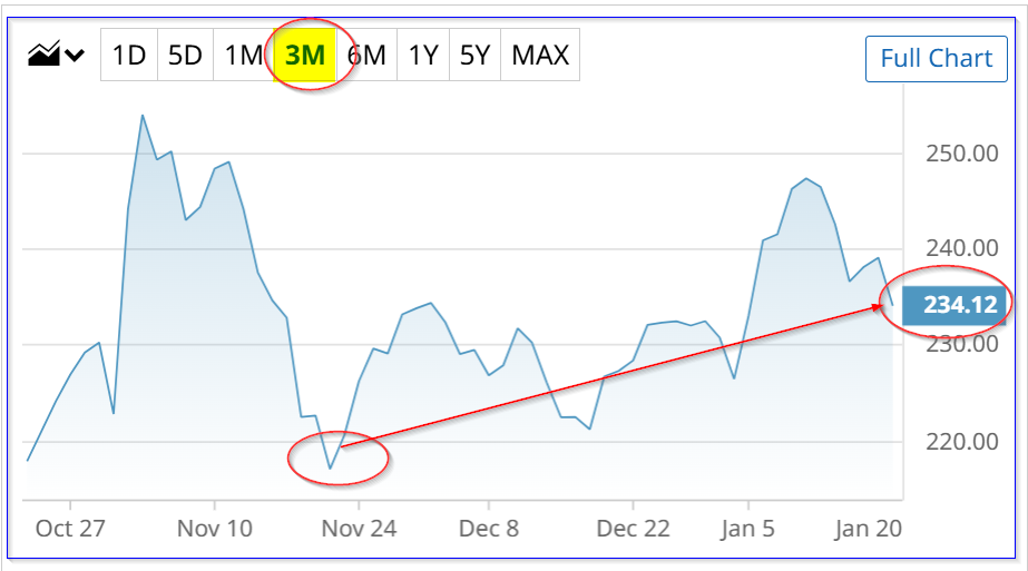 AMZN is at $234.11 in midday trading on Tuesday, Jan. 20. After Amazon released its Q3 results on Oct. 30, AMZN initially spiked to over $253, but later dropped to $217.14 on Nov. 30. Since then, it has slowly drifted higher.