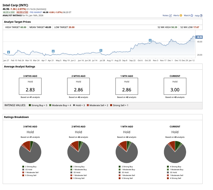 Analyst sentiment remains cautious but stable. Overall, Wall Street rates Intel stock a “Hold.” Of the 43 analysts covering the stock, four rate it a “Strong Buy,” one says it is a “Moderate Buy,” 33 rate it a “Hold,” one rates it as a “Moderate Sell,” and four suggest a “Strong Sell.” The stock has surpassed its average target price of $40.09. However, the Street-high estimate of $60 suggests the stock has upside potential of 28% over the next 12 months.