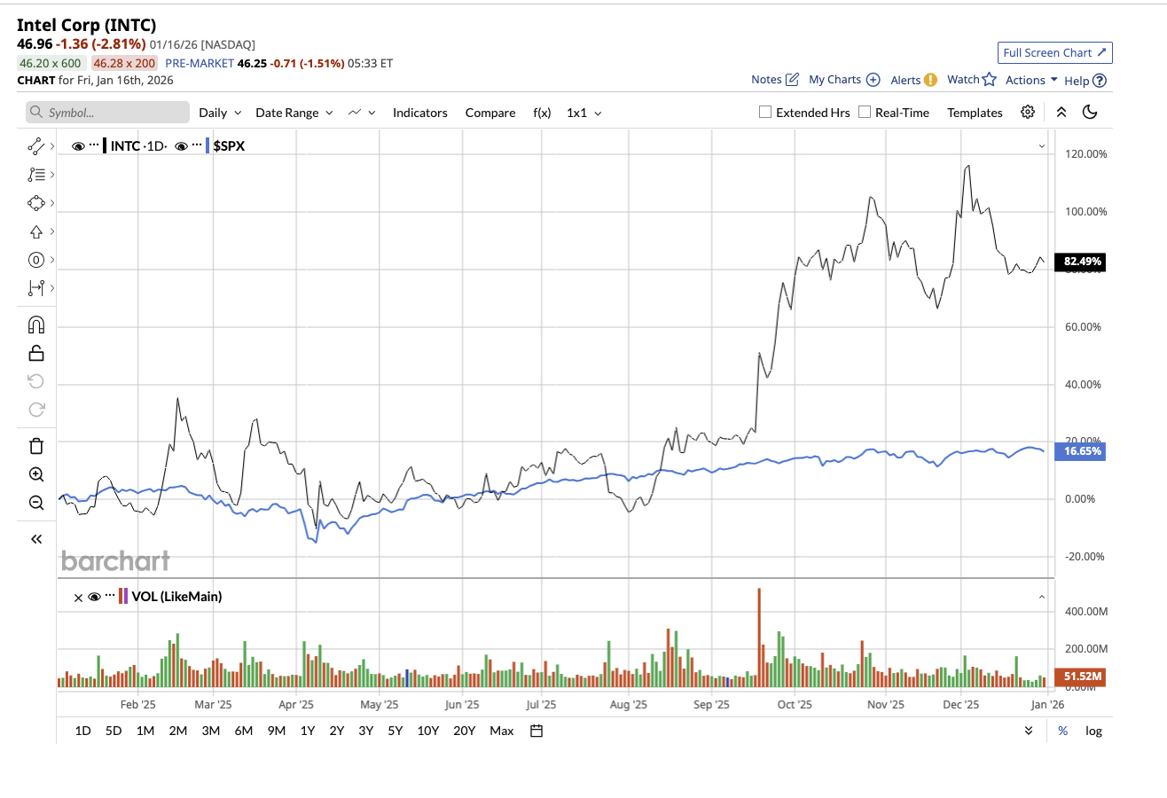 Intel (INTC) is set to report its fourth-quarter and full-year 2025 earnings on Jan 22. After several challenging years in a market dominated by AI leaders like Nvidia (NVDA) and advanced manufacturers such as TSMC (TSM), Intel’s first three quarters of 2025 suggested that a long-awaited turnaround is finally gathering steam. Intel’s shares surged 82.5% last year, dramatically outperforming the S&P 500 Index ($SPX) gain of 16.6%. So far this year, the stock is already up 19%. The question now is will another great quarter propel the stock to carry forward this momentum into 2026?