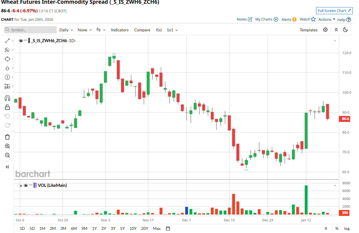 Corn, soybeans, and wheat opened the week’s trade under pressure although losses were minimal compared to the indices. The big story in the market to start the week was the escalating geopolitical tensions between the United States and the European Union over Greenland. More back and fill action for the wheat complex as values gave back the bulk of gains seen Friday in what was a quiet day of trade to start the short week. Chicago wheat led the complex lower followed by KC and then Spring wheat. The action today prompted thoughts that a correction in the wheat/corn spreads were the main driver after spreads have rallied 25-30 cents in wheats favor from recent lows. Some prominent weather groups published a story about the extreme cold being seen across the Midwest with 1/3 of the US SRW crop seeing sub-freezing temps now through the weekend. Snow cover remains limited in these areas with winterkill a threat across IL/IN/OH. Markets were immune to such a threat today but let’s see how things play out. With funds short 100K of Chicago wheat, I wonder if wheat vs corn should be looked at moving forward. With the USDA whacking any potential corn rally last week amid a potential weather threat, I posit that this break in the spread today is worth buying. Chart below. But if one can buy the March wheat vs March corn on a pullback around 80 cents wheat over, The spread may be worth a shot. It settled at 86 cents today.