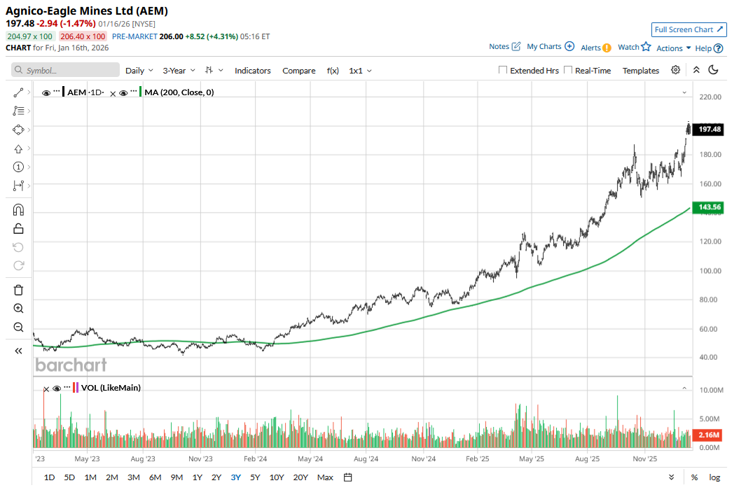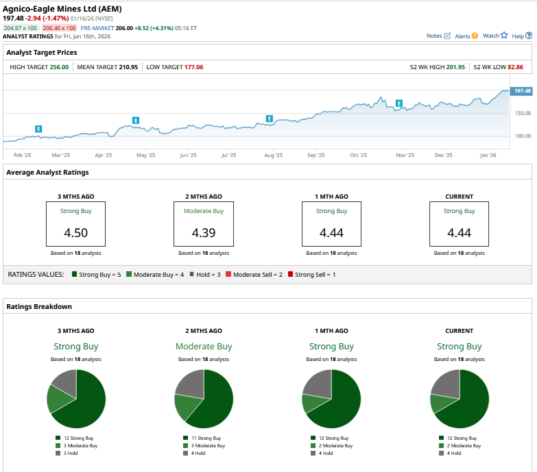 AEM has a consensus rating of “Strong Buy” from the 18 analysts polled by Barchart, even as its mean target price of $210.95 is just about 7% higher than current price levels. However, the anomaly is predominantly due to analyst action not keeping with the price action—something we see across other gold mining stocks as well. Notably, Bank of America listed AEM as among its top commodity stock picks for 2026.