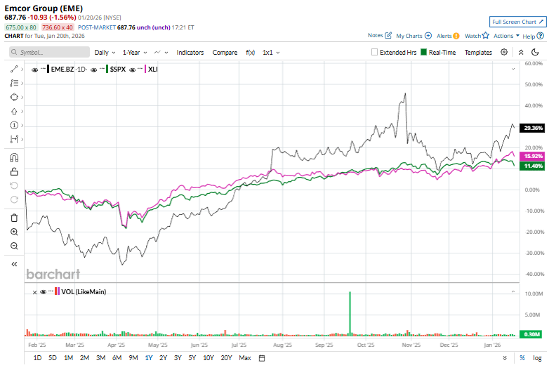 EME stock has gained 35.8% over the past 52 weeks, outperforming the Industrial Select Sector SPDR Fund’s (XLI) 18.7% surge and the S&P 500 Index’s ($SPX) 13.3% uptick during the same time frame.