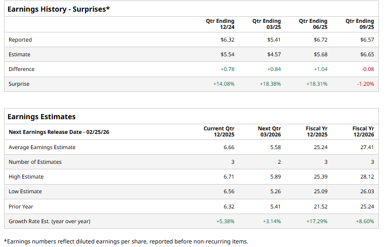 It is expected to announce its fiscal Q4 earnings for 2025 shortly. Ahead of this event, analysts expect the company to report a profit of $6.66 per share, up 5.4% from $6.32 per share in the year-ago quarter. The company has surpassed Wall Street’s bottom-line estimates in three of the past four quarters, while missing on another occasion.