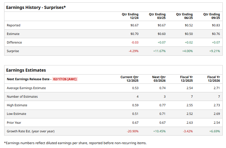 The utility company is set to announce its fiscal Q4 2025 earnings results after the market closes on Wednesday, Feb. 17. Ahead of this event, analysts expect FirstEnergy to report an adjusted EPS of $0.53, down 20.9% from $0.67 in the year‑ago quarter. It has exceeded Wall Street's earnings expectations in three of the past four quarters while missing on another occasion.