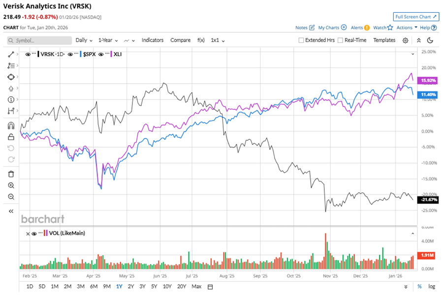 VRSK stock has notably underperformed the S&P 500 Index’s ($SPX) 13.3% gains over the past 52 weeks, with shares down 21.6% during this period. Similarly, it considerably underperformed the Industrial Select Sector SPDR Fund’s (XLI) 18.7% gains over the same time frame.