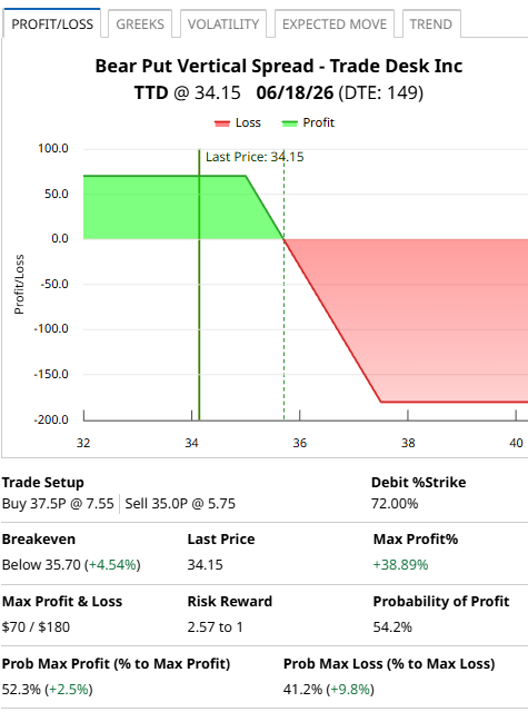 The cost of the trade is $180 which is also the maximum loss with the maximum possible gain being $70. The maximum gain would occur if Trade Desk stock closes below $35 on the expiration date.