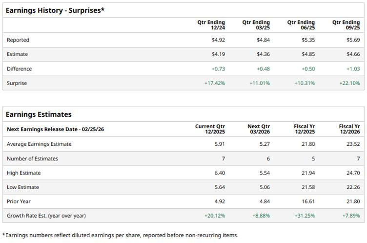 It is expected to announce its fiscal Q4 earnings results soon. Ahead of this event, analysts predict the company will report a profit of $5.91 per share, up 20.1% from $4.92 per share in the year-ago quarter. The company has surpassed Wall Street’s earnings estimates in each of the last four quarters.