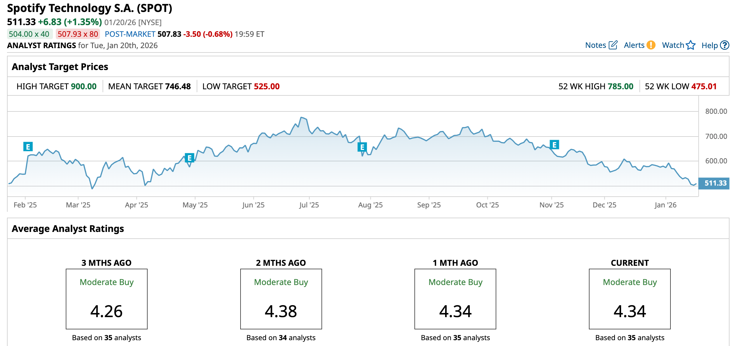 After rallying sharply earlier in the year and reaching a record high of $785 in June 2025, SPOT underwent a broad pullback through the rest of the year, currently down 34.8% from its peak. Over the past 52 weeks, shares have been up 5.31%.