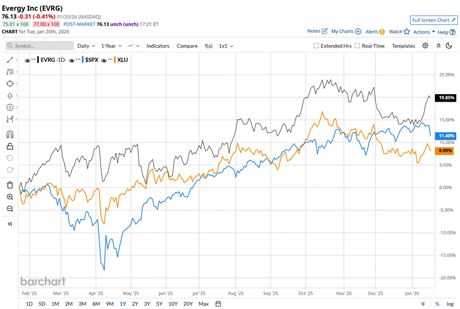 EVRG stock has surged 20.5% over the past 52 weeks, outperforming the S&P 500 Index’s ($SPX) 13.3% rise and the State Street Utilities Select Sector SPDR ETF’s (XLU) 9% return during the same time frame.