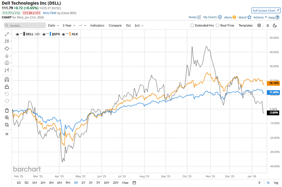 Shares of Dell Technologies have declined marginally over the past 52 weeks, lagging behind the broader S&P 500 Index's ($SPX) 12.8% rise and the State Street Technology Select Sector SPDR ETF's (XLK) 20.9% return over the same period.