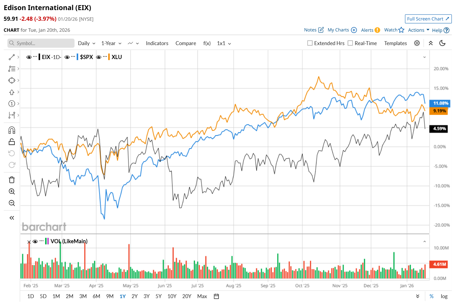 EIX has declined 4.5% over the past 52 weeks, considerably underperforming both the S&P 500 Index's ($SPX) 13.3% return and the State Street Utilities Select Sector SPDR ETF’s (XLU) 9% uptick over the same time period.