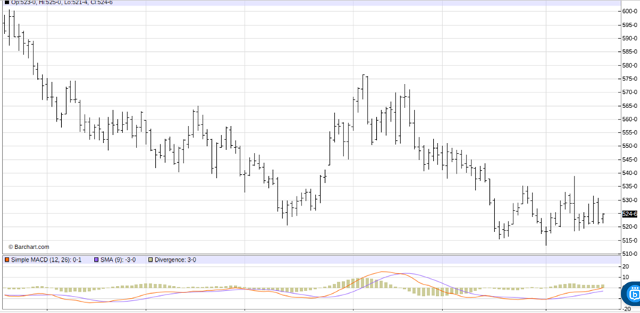 See on the daily bar chart for May soft red winter wheat futures that prices have been trading choppy and sideways at lower levels for four weeks. It’s my bias that this price action is “basing” that will put in a market bottom and set off a price uptrend. See, too, at the bottom of the chart that the moving average convergence divergence (MACD) indicator is in a bullish posture as the blue MACD line is above the red trigger line and both lines are trending up.