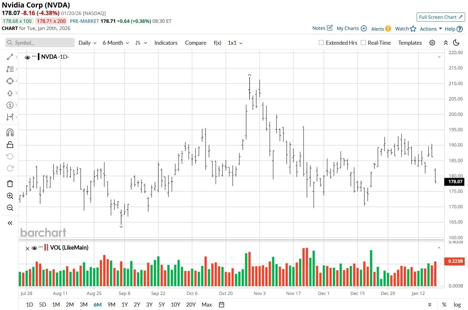 Note that NVDA remains decisively above its 200-day moving average (MA), signaling its broader uptrend remains intact.