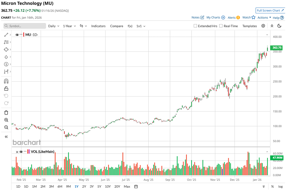 With a market cap brushing $410.8 billion, MU stock has climbed 251.1% over the past 52 weeks. It gained 239.2% in six months and added another 44.4% in the last month alone, reflecting higher memory pricing amid constrained industry supply.