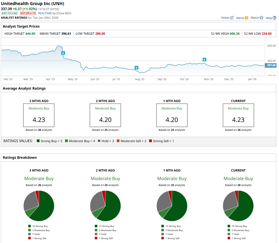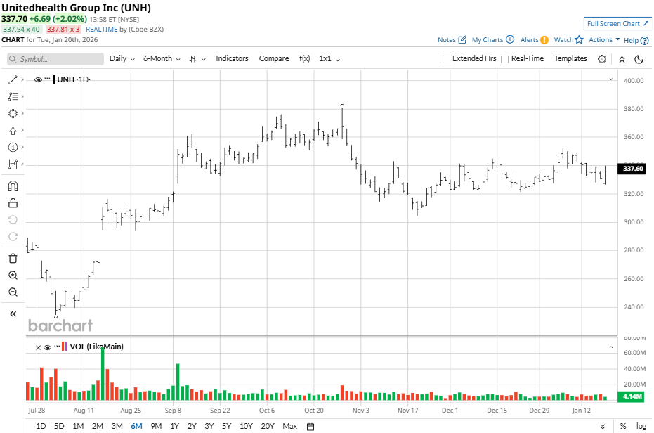 UNH stock is down 44% from its 52-week high of $606.36 but up 47% from the $234.60 low, pressured by Medicare Advantage costs and earnings misses in 2025. Recent performance shows a 3% gain for the past five days, a 5% gain for the past one month, and a nearly 6% loss over the past three months. UNH stock is also up 4.5% year-to-date (YTD) but down 35% for the past 52 weeks.