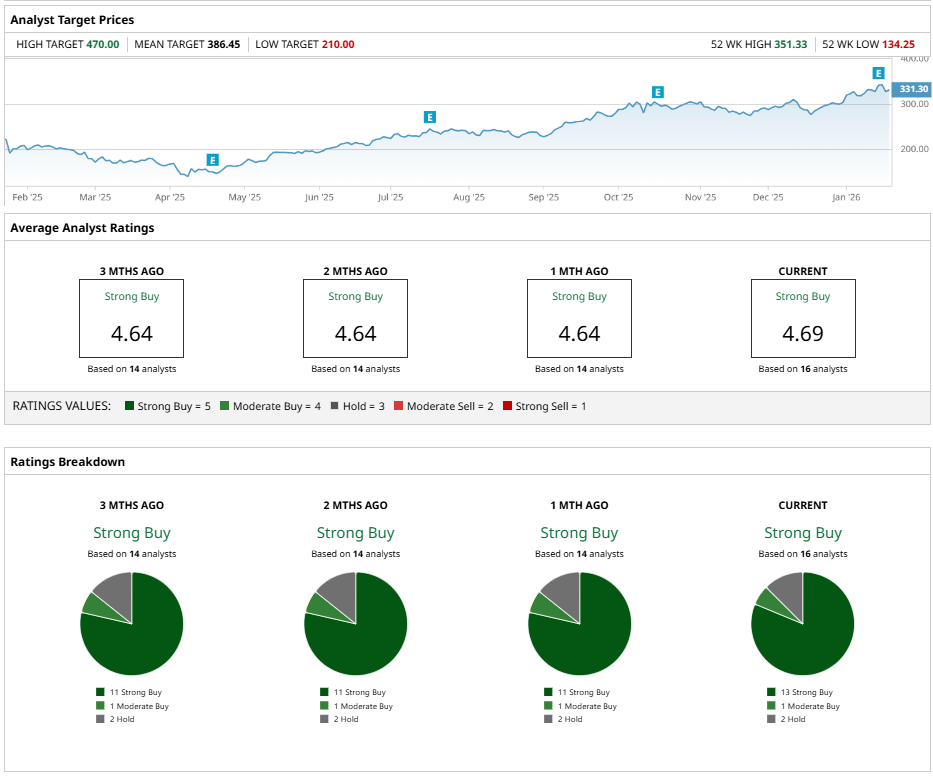 Of 16 analysts who cover TSMC stock, 13 of them have “Strong Buy” ratings and one has a “Moderate Buy” rating. The remaining two suggest holding. None of them recommend selling, and that sentiment has been consistent for the last several months. Analysts have a consensus price target of $386.45 on TSM stock.