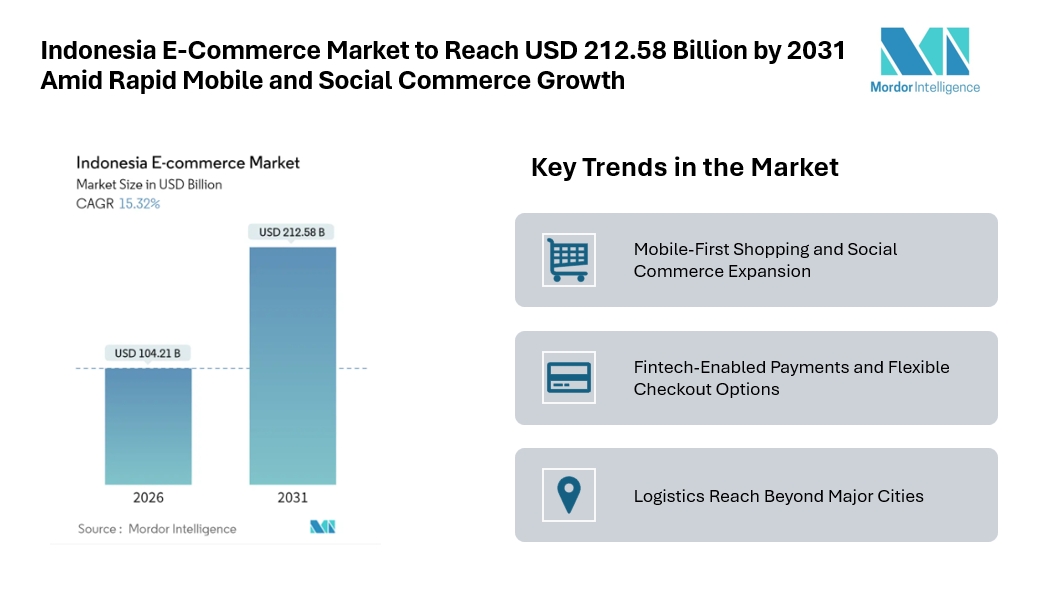The Indonesia E-Commerce Industry continues to stand out as one of the most active digital retail landscapes in Southeast Asia. According to Mordor Intelligence, the Indonesia E-Commerce Market size is projected to expand from USD 90.35 billion in 2025 to USD 104.21 billion in 2026, and further reach USD 212.58 billion by 2031, reflecting steady momentum over the forecast period. The Indonesia E-Commerce Market forecast highlights how social commerce formats, logistics expansion, and fintech-enabled checkouts are shaping buyer behavior.