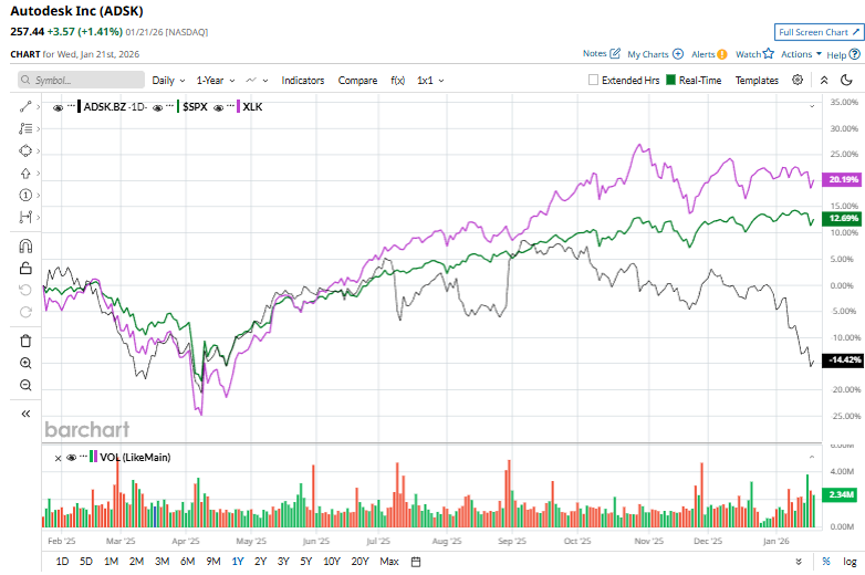 Over the past year, ADSK stock has dipped 13.3%, underperforming the S&P 500 Index’s ($SPX) 13.7% gains and the Technology Select Sector SPDR Fund’s (XLK) 21.8% gains over the same time frame.