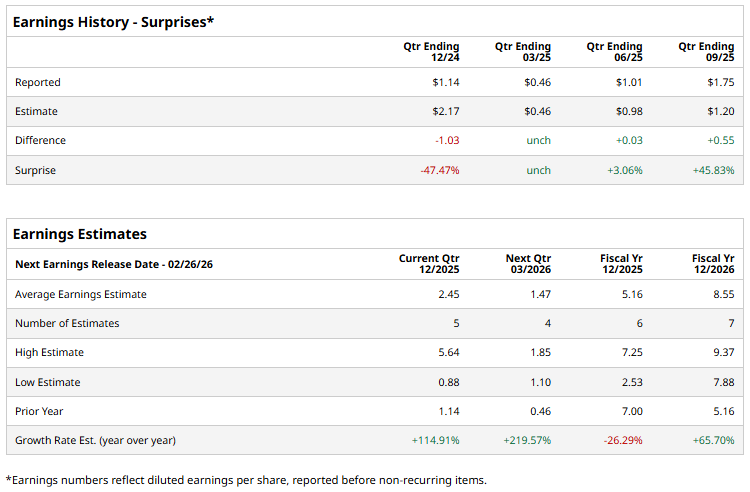 The utility company is expected to unveil its fiscal Q4 2025 results soon. Before the event, analysts anticipate Vistra to report an EPS of $2.45, up 114.9% from $1.14 in the year-ago quarter. It has surpassed or met Wall Street's bottom-line estimates in three of the past four quarters while missing on another occasion.
