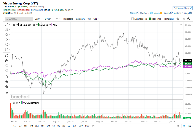 VST stock has declined 13.7% over the past 52 weeks, underperforming the S&P 500 Index's ($SPX) 13.7% gain and the Utilities Select Sector SPDR Fund's (XLU) 7.5% increase over the same period.