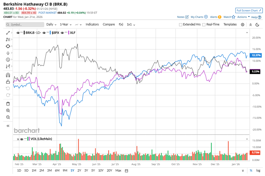 BRK.B stock has underperformed the S&P 500 Index’s ($SPX) 13.7% gains over the past 52 weeks, with shares up 3.3% during this period. Similarly, it underperformed the Financial Select Sector SPDR Fund’s (XLF) 5.6% gains over the same time frame.