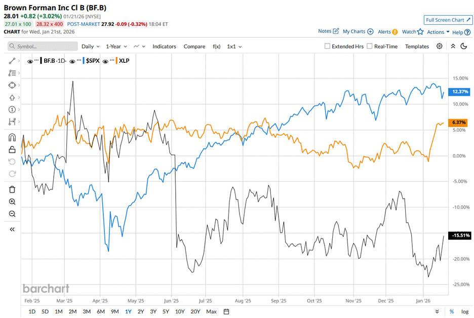 BF.B stock has declined 17.1% over the past 52 weeks, underperforming the S&P 500 Index’s ($SPX) 13.7% rise and the State Street Consumer Staples Select Sector SPDR ETF’s (XLP) 6.2% return during the same time frame.
