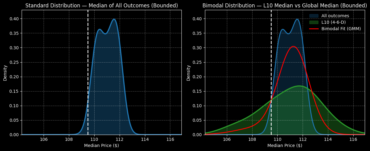 Now, that doesn’t really help us in terms of narrowing the expected dispersion. However, probability density is highest between $110 and $113. Basically, under multiple trials of the 4-6-D sequence, we would expect EXE stock to terminate between $110 and $113 at the end of the next five weeks.
